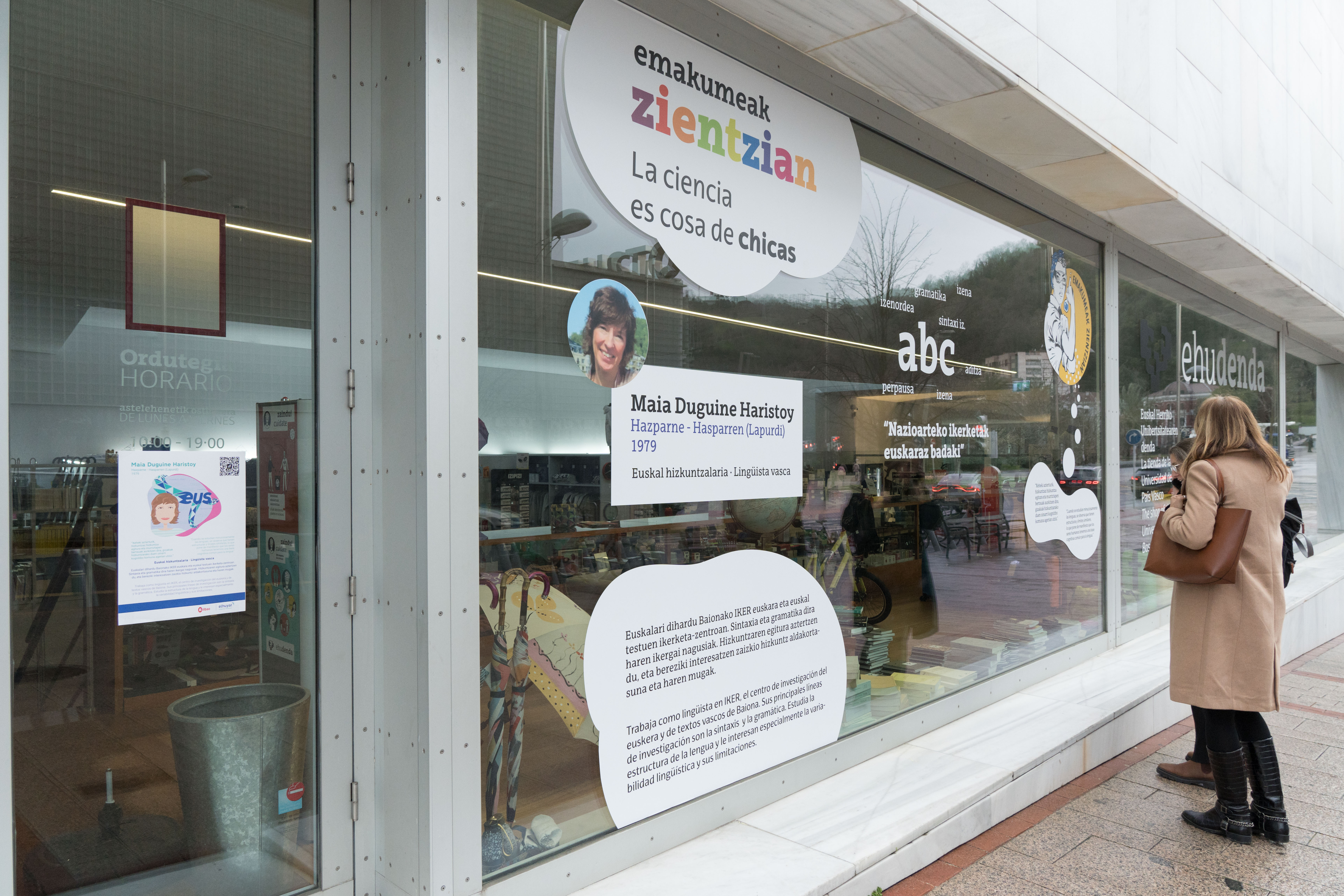 Bilboko 50 establezimenduetako bakoitzak bere erakusleihoa eskainiko dio zientzialari baten lanari; horretarako, gaurtik aurrera, emakumezko zientzialari baten lanari buruzko informazioa duten irudiak eta kartelak jartzen hasiko dira establezimenduetan, eta haren ikerketan inspiratutako irudiekin apainduko dituzte dendak. Modu horretan, saltzaileak 12 zientzialari horien lanaren eta bizitzaren dibulgatzaile bihurtuko dira, eta emakumeek zientziari egindako ekarpena herritarrei helarazten lagunduko dute.